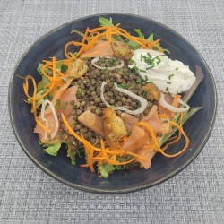 Norvégienne du berry : Truite fumée, Fromage frais, lentilles, Carottes, Echalotte, Ciboulette, Mesclun, Croûtons