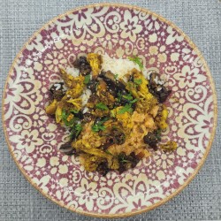 Boeuf haché, tomate, oignons, maïs, haricots rouges, ail servi avec du riz