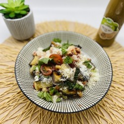 * aubergine, courgette, tomate, basilic, ricotta et pignons