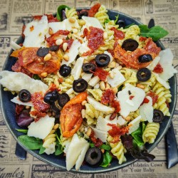 Salade chorizo, pâtes pesto, pignons, parmesan, tomates confites, olives noires