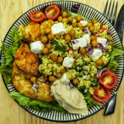 Salade Falbala, poulet aux épices, feta, houmous, pois chiche grillés, boulgour, herbes et oignons rouges.