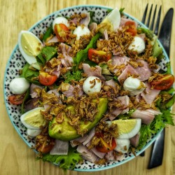 Jambon blanc, avocat, mozzarella, œuf dur, oignons frits, tomates cerise et salade