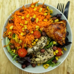 La salade feuillette :Salade, Maïs,Carottes râpées, Tomates rôties, Poulet, Noisettes, Feuilleté chèvre miel