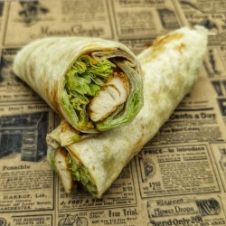 wrap western : Galette wrap, Poulet pané, sauce barbecue, cheddar, guacamole, oignon frit, tomate, iceberg