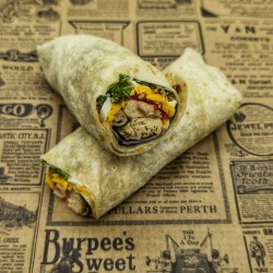 Wrap buffalo : Poulet, bacon, salade, tomates, sauce ranch, oignons frits, cheddar râpé, oeuf