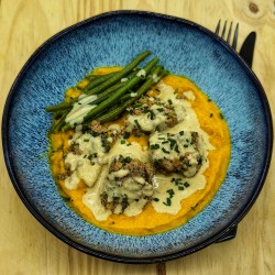 Boulette de boeuf aux épinards sauce moutarde, mousseline de légumes* et haricots verts
