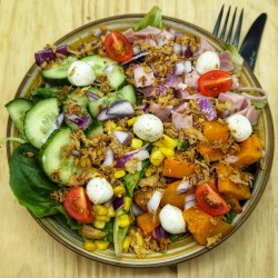 Salade, potimarron, concombre, jambon blanc, mozzarella, tomates confites, maïs, oignons rouge, oignons frit