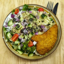 La Levantine : Salade, Poulet pané, taboulé (boulgour, semoule raisin, herbes) crème aux herbes citronné, concombre, oignons rouges, tomates cerises, graines