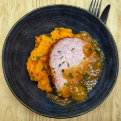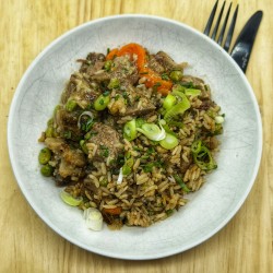 Bœuf au caramel*, riz, pousse de soja, épis de maïs, cacahuète et menthe