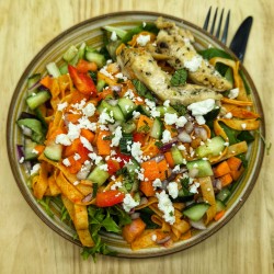 Salade Poulet, fêta, pâtes à la poivronnade, légumes croquants( carottes, concombre, oignons rouges, poivrons) menthe