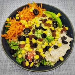 Salade d'Akhenaton John : Taboulé, rillettes de Thon, Carottes râpées, Concombre, Tomate, Menthe, Avocat, Oeuf, Olive, Maïs, noix de cajou, oignons rouges, Raisin secs