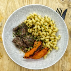 Joue de porc confite* pâtes, potimarron rôti