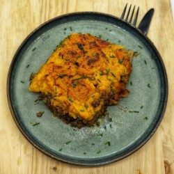 VG : Parmentier de potimarron aux lentilles, oignons, carottes, cèleri, ail, champignons et tomates