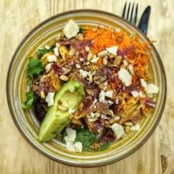 Jambon cru, feta, avocat, pâtes à la tomatade, carottes râpées, pignons, parmesan, oignon frit, salade