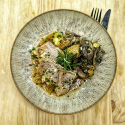 Andouillette de canard, crème à la moutarde de Meaux et pommes de terre sautées*