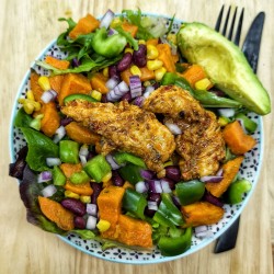 Poulet mariné tex-mex, patates douces, maïs, avocat, poivrons verts, haricots rouges, oignons rouges, salade
