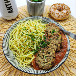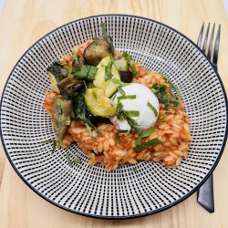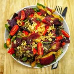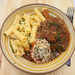 SICILIENNE: Bresaola, fusilli tomatade, poivrons rouges, aubergine herbes Provence , crumble parmesan maison, tomates cerises au basilic