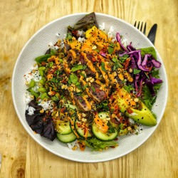 La salade Atacama : Salade, steak végétal, carottes, fèves, cranberries, avocat, radis, maïs, crème au curry, graines