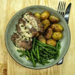 Onglet de veau, sauce au poivre et pomme de terre grenaille, haricots verts, ciboulette