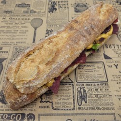 Pain baguette, poulet, parmesan, mayonnaise, tomate, roquette.