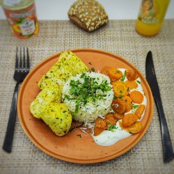 Boulettes de kefta de poulet, carottes aux herbes, fromage blanc au miel et aux herbes* et riz