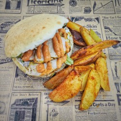 Pain kebab, lamelles volailles rôties, pain, sauce algérienne, tomate, oignon, salade et potatoes maison