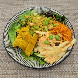 Poulet au curry, Chou coleslaw, Céréales asiatiques, Carottes râpées, Raisins secs, Fèves, cacahuètes, vinaigrette citron
