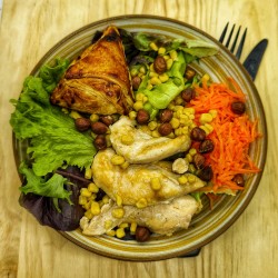 La salade feuillette :Salade, Maïs,Carottes râpées, Tomates rôties, Poulet, Noisettes, Feuilleté chèvre miel