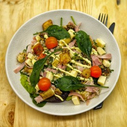 Jambon blanc, tome de Savoie, sauce Deluxe, duo de riz et sarrazin, tomate, concombre, poivrons grillés, artichauts marinés, pousses d'épinards, noix, crouton, vinaigrette citron