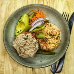 Sun Salad : Tomate farcie au Fromage frais et Thon, herbes fraiches(persil coriandre), Riz aux Tomates Confites, Carottes râpées, Avocat, Cornichons et Oignons rouges.