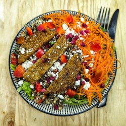 CHiziya Lala : Lentilles quinoa petit épeautre carotte tomates confites fêta poivron rouges steak végétal grenade