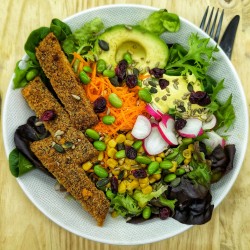 La salade Atacama : Salade, steak végétal, carottes, fèves, cranberries, avocat, radis, maïs, crème au curry, graines