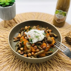 Purée de potimarron, butternut, pomme de terre noisettes champignons œuf poché