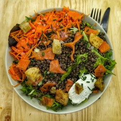 Norvégienne du berry : Truite fumée, Fromage frais, lentilles, Carottes, Echalotte, Ciboulette, Mesclun, Croûtons