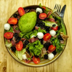 Salade, Mozzarella, Avocat , Jambon cru, Olives, tomates cerises