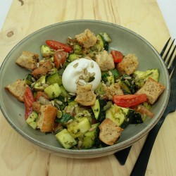 VG / Panzanella : courgettes, tomates, concombres, croûtons, oignons rouges, ail, burratina,...