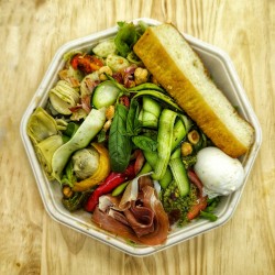 salade,Jambon de Parme, tomate et burratina, salade de pâtes au pesto de pistache, tomate séchée et pancetta grillée, anti pasti de légumes grillés ,( poivron, artichaut poivrade)tagliatelle de courgette a l'origan et citron,foccacia, noisettes et basilic
