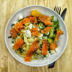 truite fumée, feta, tagliatelles, courgettes en tagliatelles, tomates cerises, menthe et graines