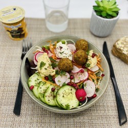 Libanaise : Salade Libanaise / Salade, chou BLANC, radis, carottes, cranberrie, falafel, houmous, aïoli, sumak, concombre, menthe