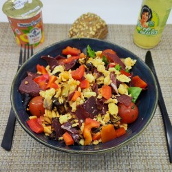 SICILIENNE: Bresaola, fusilli tomatade, poivrons rouges, aubergine herbes Provence , crumble parmesan maison, tomates cerises au basilic