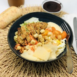 Tenders végétariens (blé, maïs, pommes de terre), sauce Caesar, parmesan, croûtons, carottes, oeuf, noix de cajou, salade