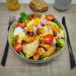 Salade, jambon, poulet mariné aux oignons caramélisés, miel, balsamique, emmental, maïs, carottes râpée, carottes, oeuf, tomates
