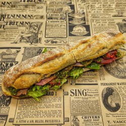 Pain baguette, bacon grillé, pesto basilic, tomates confites, parmesan et salade.