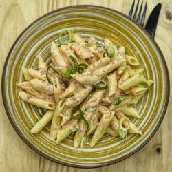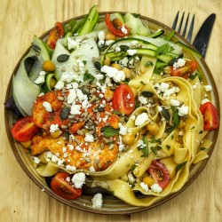 La zucchine :Salade, pates et tagliatelle de courgette, pois chiche, feta, menthe, graines, tomates, cerises, et poulet mariné au citron et paprika fumé