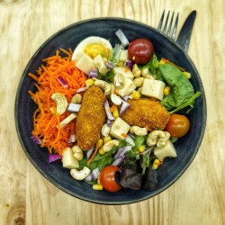 poulet pané, gruyère, carotte râpée, tomate cerise, mais, œuf, oignon rouge et noix de cajou, salade